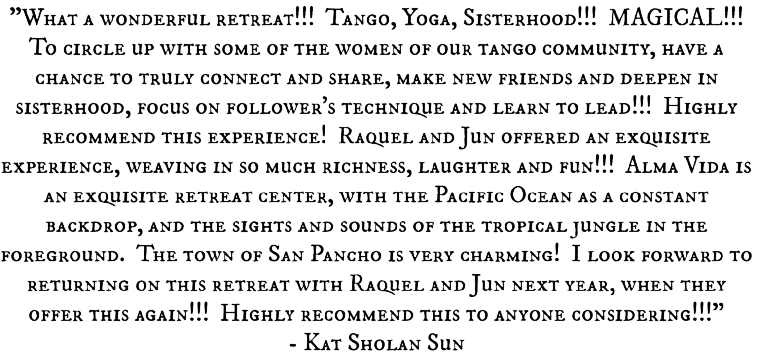 Reconnect to yourself as a woman and as a dancer. Join me for a 6 day, all inclusive retreat directly on the beach of San Pancho, Mexico. The retreat will include daily classes of yoga, follower’s Tango technique/ expression classes, and Tango leading classes. For the healing aspect, we will be doing women’s circles, a Temazcal ceremony, and a crystal sound journey. Let go, begin to heal, and develop the beautiful artist that you are.